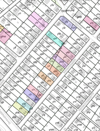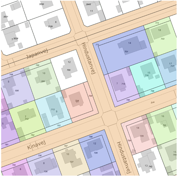 Servitutarealer. Servitutarealer registreres ikke i matriklen som selvstændige ejendomme. Der har dog tidligere været praksis for det, særligt i Københavns Kommune. Servitutarealet udgør en selvstændige samlet fast ejendom, hvor adkomsten til servitutarealet er det samme som til den tilgrænsende ejendom, og hvor servitutarealet anvendes som en del af den tilgrænsende ejendom. Se eksemplet her fra Japanvej, Kinavej og Siamvej i København. De ejendomme, der er fremhævet med en farve udgør samvurderede ejendomme. Servitutarealet udgør en 5 alen bred strimmel langs vejen. Servitutarealet ejes af den bagved liggende ejendom.